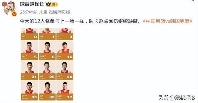 北京时间12月1日,世预赛窗口期继续开打,中国男篮客场对阵韩国男篮,根据FIBA官方更新的12人名单,中国男篮12人名单继续保持上一场一致,赵睿因为伤病困扰继续缺席。