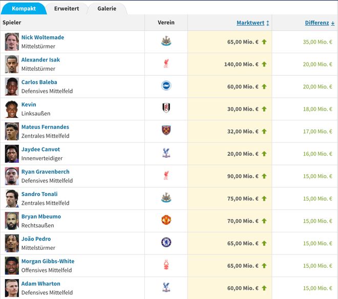 沃尔特马德(纽卡):目前身价6500万欧元,此次上涨了3500万欧元;